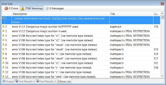 Обратим внимание на один важный момент, связанный с использованием демонстрационной версии PVS-Studio. Когда демонстрационная версия используется для проверки кода, то хотя и обнаруживаются все потенциальные ошибки, информация о том, где они расположены в тексте программы, показывается не во всех диагностических сообщениях. Вместо номера строки выводится текст "TRIAL RESTRICTION", как показано на рисунке 4.