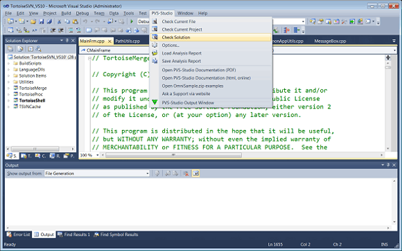 Открываем проект TortoiseSVN и запускаем анализ. Для этого в меня PVS-Studio выберем команду Check Solution.