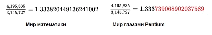 An odd feature of these three examples that for want of time I have not pursued and that may or may not have a uniform explanation is that in every case the error can be described approximately by saying that the Pentium omitted two of the repeating digits, underlined with ^^ in the above. This yields a simple heuristic for emulating a Pentium on these three examples: calculate 4.999999/14.999999 or whatever on your pocket calculator, then delete two of the repeating digits; the result is good to one digit beyond the repeating string (actually two in the 5/15 case).