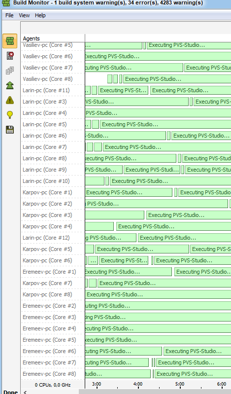 Всё просто: выставил параметр ThreadCount в настройках PVS-Studio, равный количеству доступных ядер (145), запустил анализ и сел в ожидании того, что сейчас увижу, как 145 процессов PVS-Studio.exe будут исполняться параллельно на удалённых машинах. У приложения Incredibuild есть удобная система мониторинга распараллеливания Build Monitor, через которую можно наблюдать, как процессы запускаются на удалённых машинах. Что-то подобное я и наблюдал в процессе анализа: