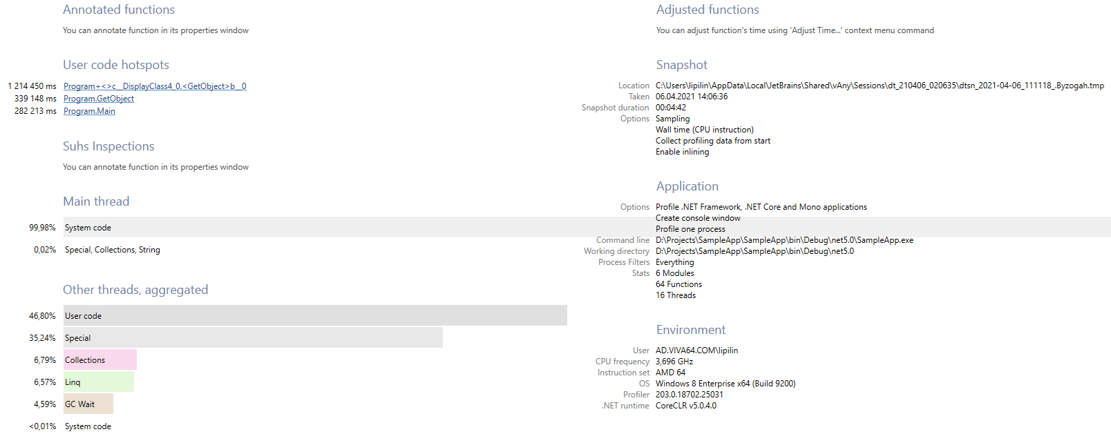 Здесь нам доступно большое количество различной информации. В первую очередь интересно время работы отдельных методов. Также может быть полезно узнать время работы потоков. Доступна и возможность рассмотрения общего отчёта – для этого нужно кликнуть в верхнем меню View->Snapshot Overview или использовать комбинацию Ctrl+Shift+O.