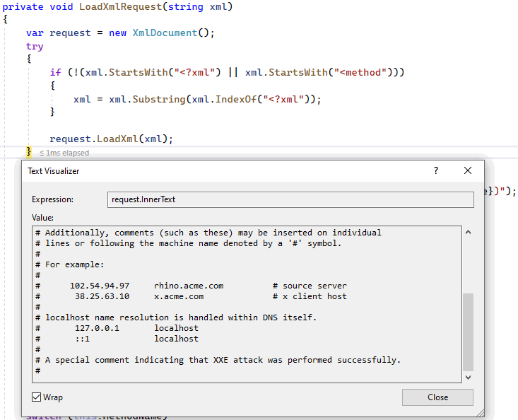 Как видим, аргумент действительно обрабатывается XML-парсером: request.LoadXml(xml). PVS-Studio здесь считает, что request сконфигурирован так, что является уязвимым к XXE. Наша задача – подтвердить это. Или же опровергнуть и тогда отметить предупреждение как false positive. Здесь нам пригодится теория, которую мы разбирали в начале статьи.