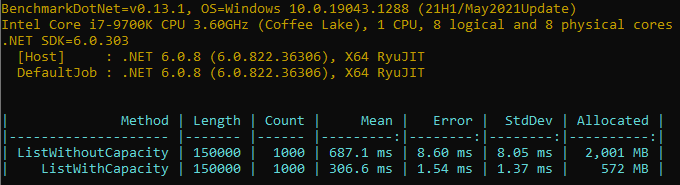 В данном случае происходит добавление в list 150 000 элементов. Для наглядности проведём эту операцию 1000 раз. И сравним производительность с таким же методом, но с указанным capacity, который равен количеству операций добавления.