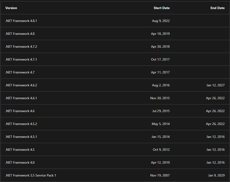 Все мы когда-то задавались вопросом: "Сколько ещё будет поддерживаться .NET Framework?" Кажется, ответа нет даже в Microsoft, но у автора этой заметки есть небольшое предположение. Дело в том, что все версии выше .NET Framework 4.6.2 не имеют даты прекращения поддержки.