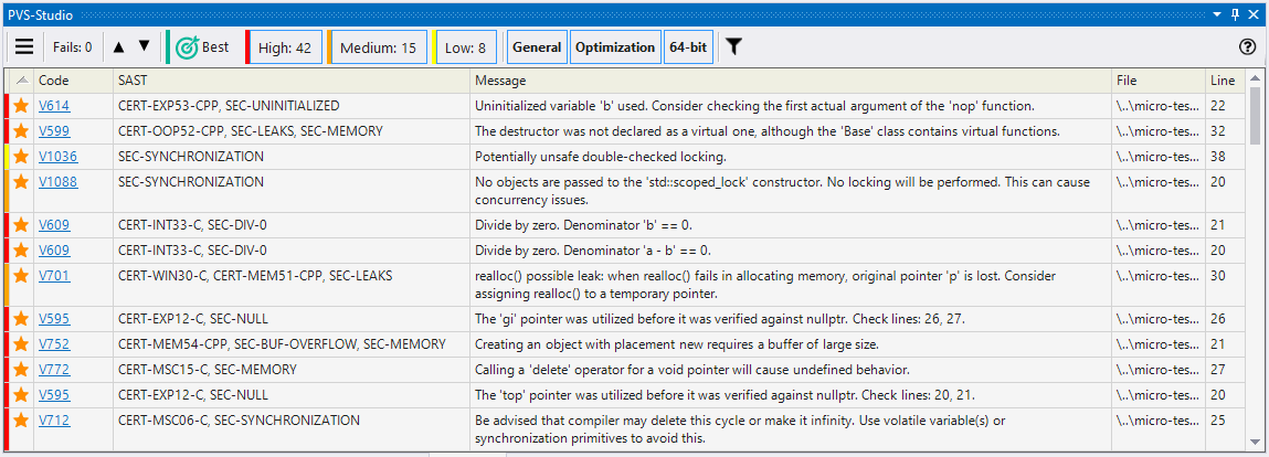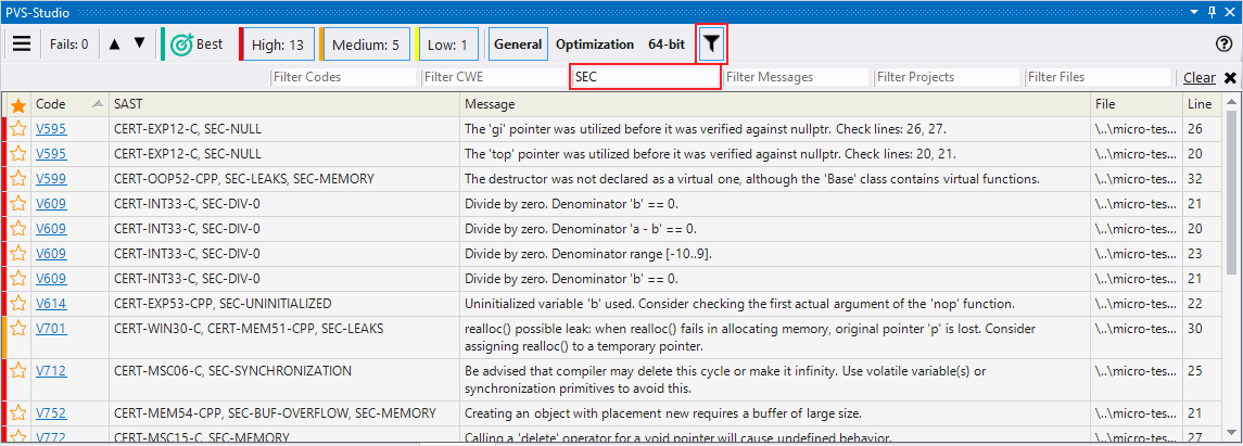 Статический анализатор PVS-Studio добавляет специальные идентификаторы (флаги) к предупреждениям, которые относятся к критическим типам ошибок. Они относятся к столбцу SAST и начинаются с префикса SEC- (сокращение от SECURITY).