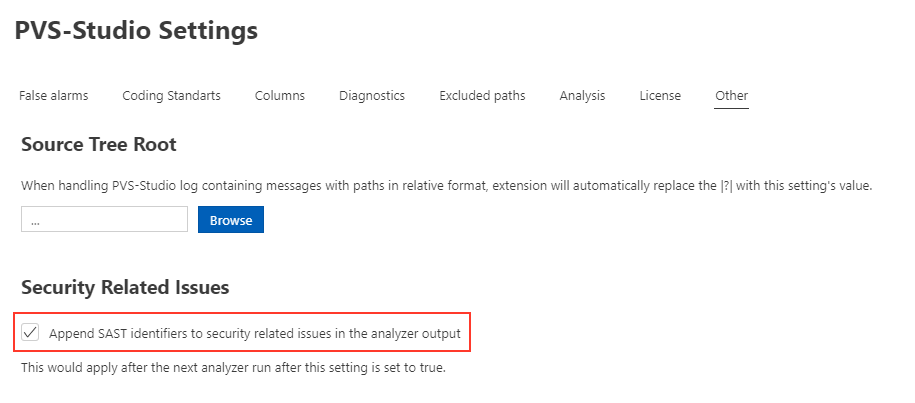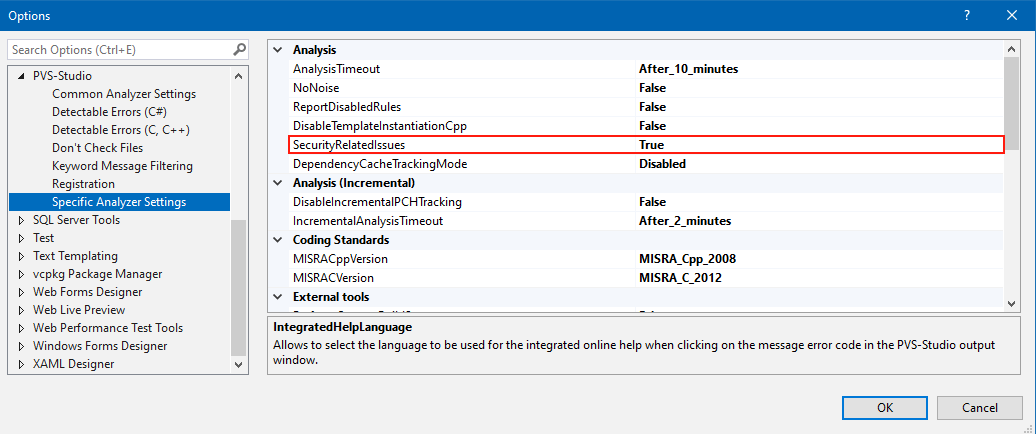Options > PVS-Studio > Specific Analyzer Settings > Analysis > SecurityRelatedIssues.
